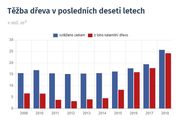 Lesníci v roce 2018 v Česku vytěžili rekordních 25,7 milionu metrů krychlových dřeva. Většina z poražených stromů přitom padla v rámci takzvané nahodilé těžby, kdy je dřevo stromu poškozeno.
